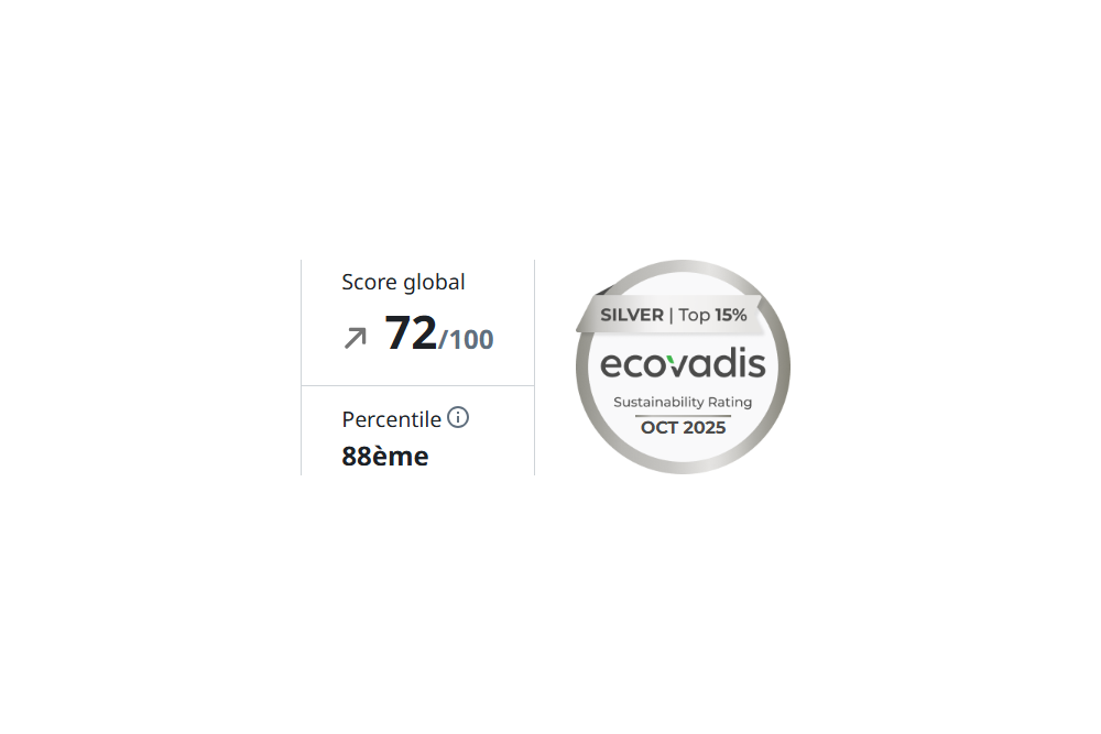 Pour cette année 2025, nous sommes fiers d’annoncer un score de 72/100, nous plaçant dans le top 12 des entreprises évaluées et l'obtention d'une médaille d'argent. Cette progression confirme notre volonté d’améliorer continuellement nos pratiques RSE et d’intégrer ces enjeux dans tous nos projets.