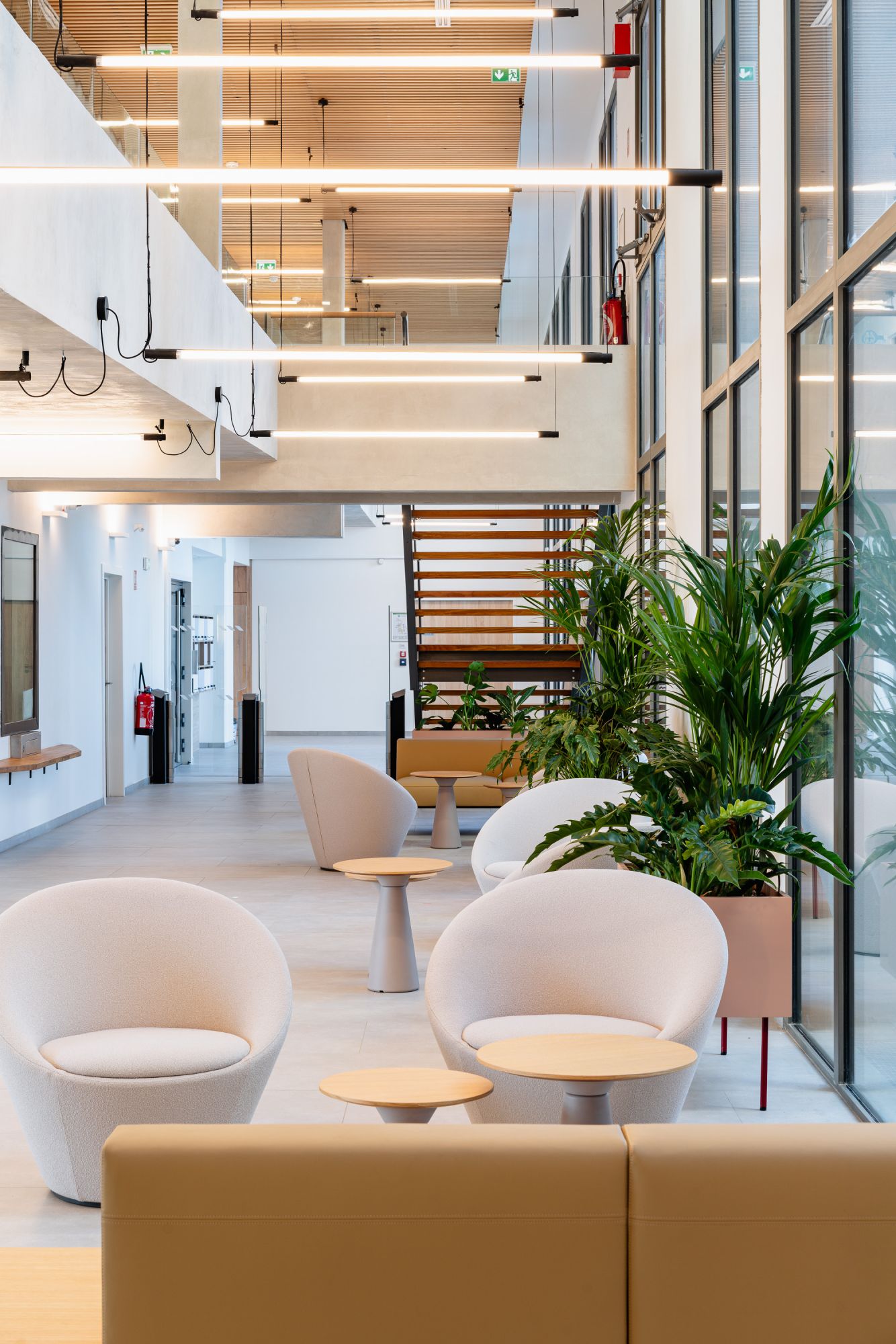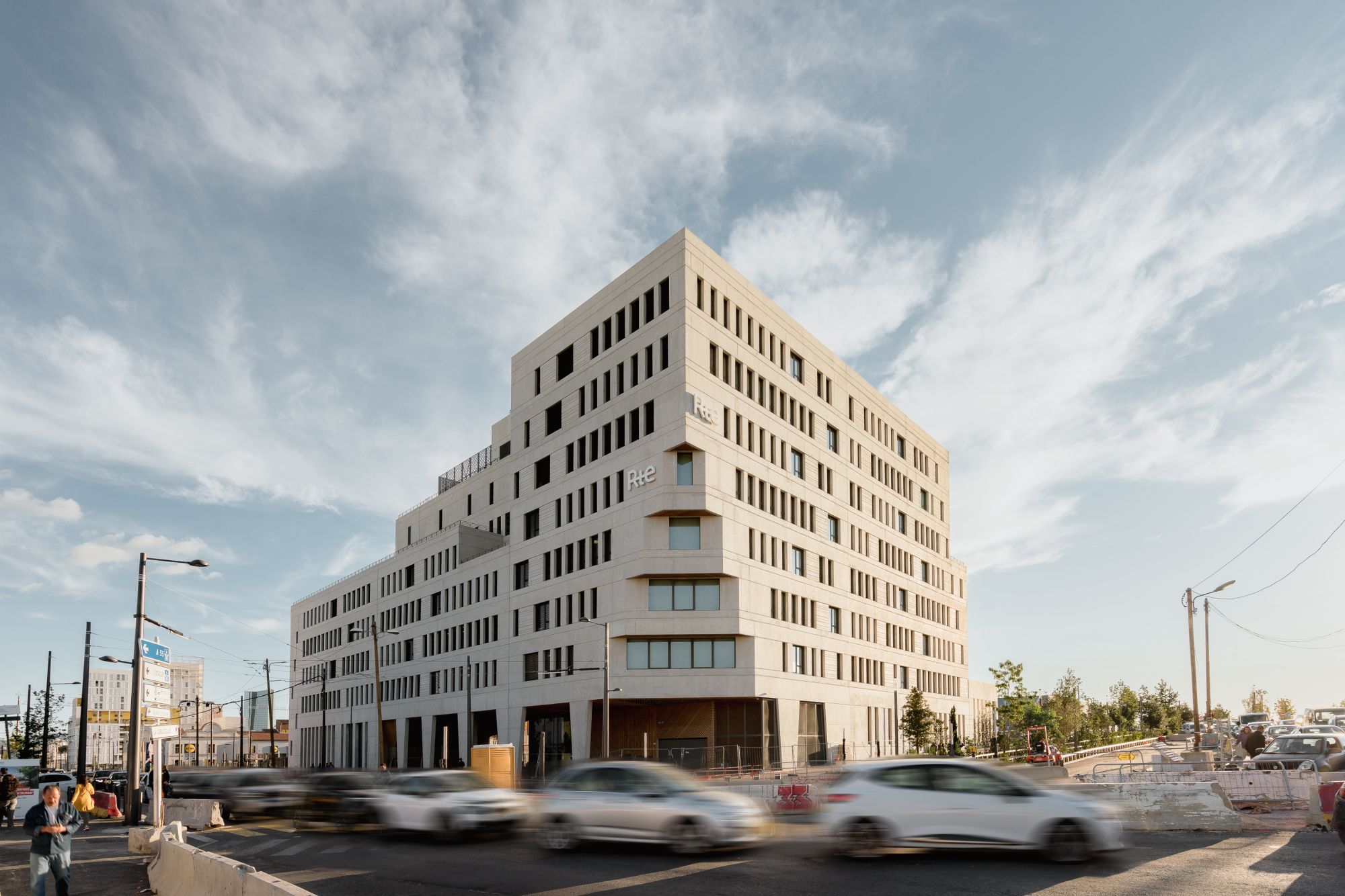 Le projet conçu par les agences Kardham Architecture et Vincent Lavergne Architecture et Urbanisme propose deux visages. Côté rue, le bâtiment se montre sobre, minéral, en cohérence avec l’architecture bioclimatique développée au sein des Fabriques où la qualité de vie est un pilier de la conception. Puis, à l’intérieur, l’ouvrage se déploie autour d’un patio central traversant, ouvert sur un vaste cœur d’îlot arboré, à l’abri des fortes chaleurs et du vent. Créant un cocon de lumière, ces espaces où l’on respire, contribuent à la qualité de vie au travail des collaborateurs. Les terrasses de travail, les bureaux et les espaces informels de rencontres offrent toutes les qualités d’un immeuble de bureaux contemporain.