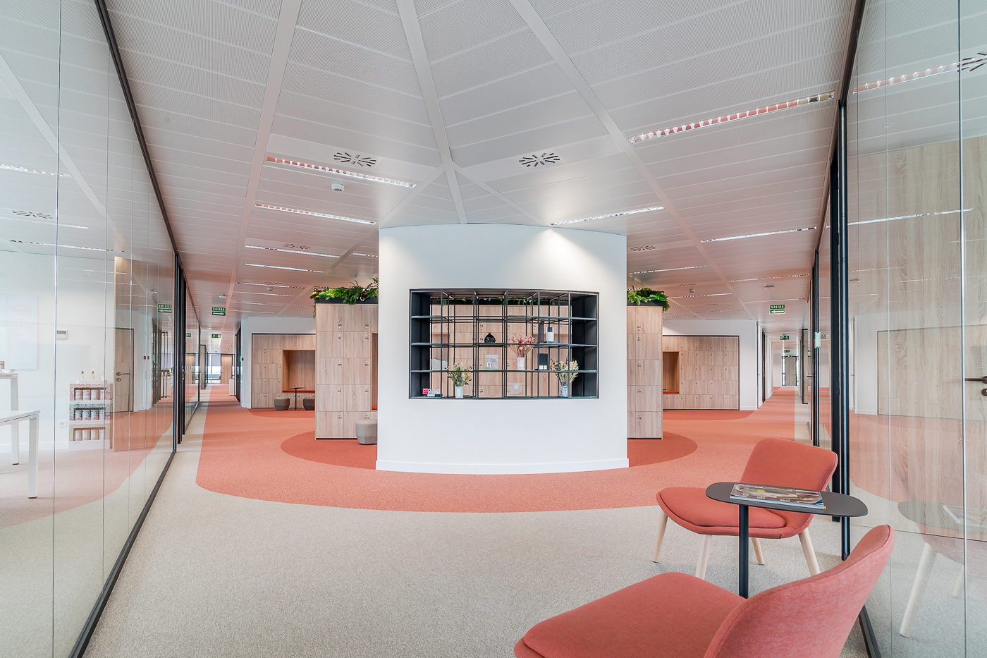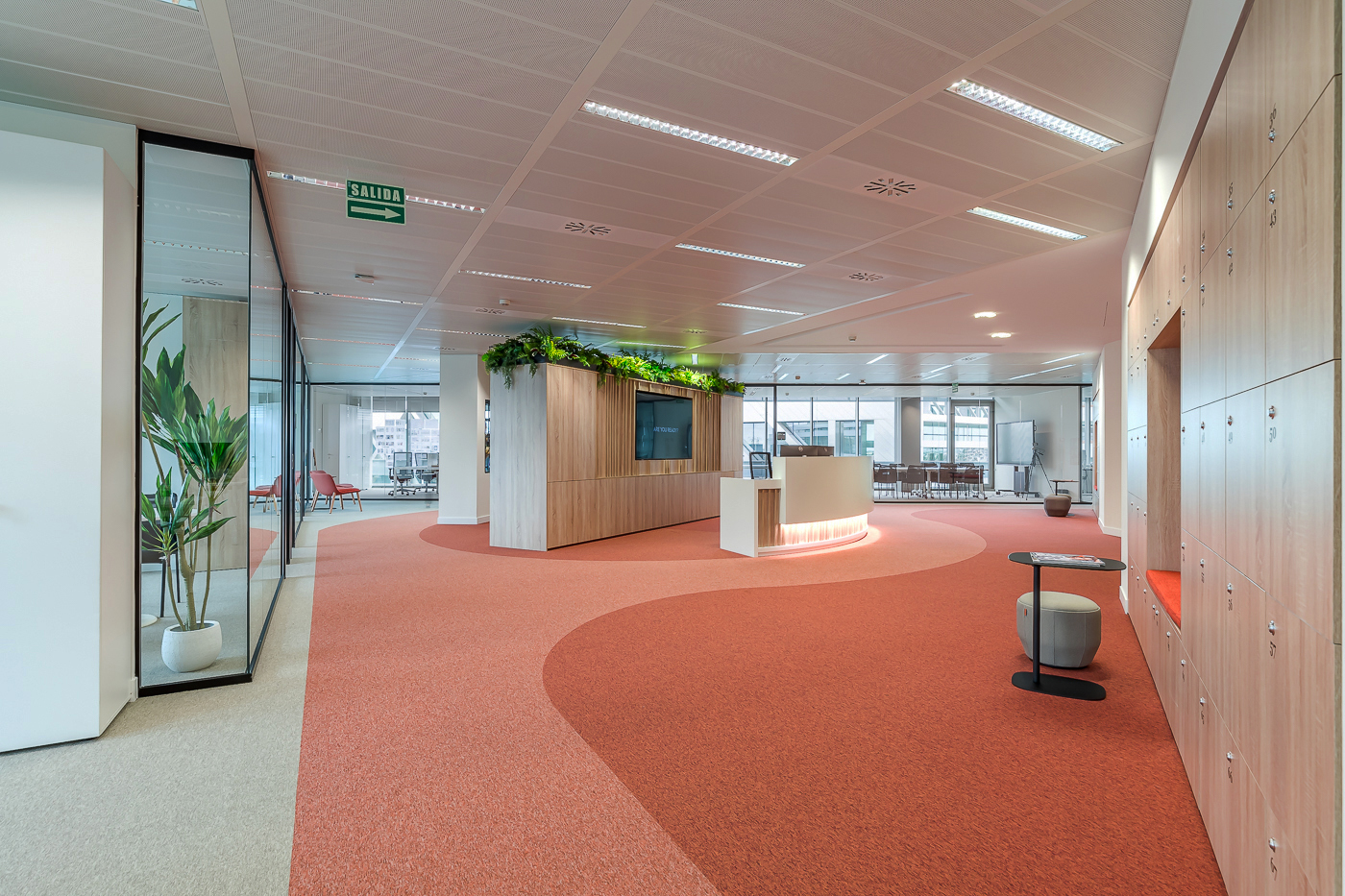 El desafío principal de este proyecto era el de facilitar el desarrollo del trabajo híbrido sin restricciones. Cada departamento se diseñó meticulosamente para incorporar tanto puestos de trabajo flexibles como estaciones fijas, con áreas de reuniones que incluyen espacios cerrados e informales, además de cabinas telefónicas. La premisa fundamental fue crear espacios colaborativos que promovieran la interacción entre los diferentes departamentos, todo ello manteniendo un equilibrio esencial entre la privacidad y la confidencialidad.