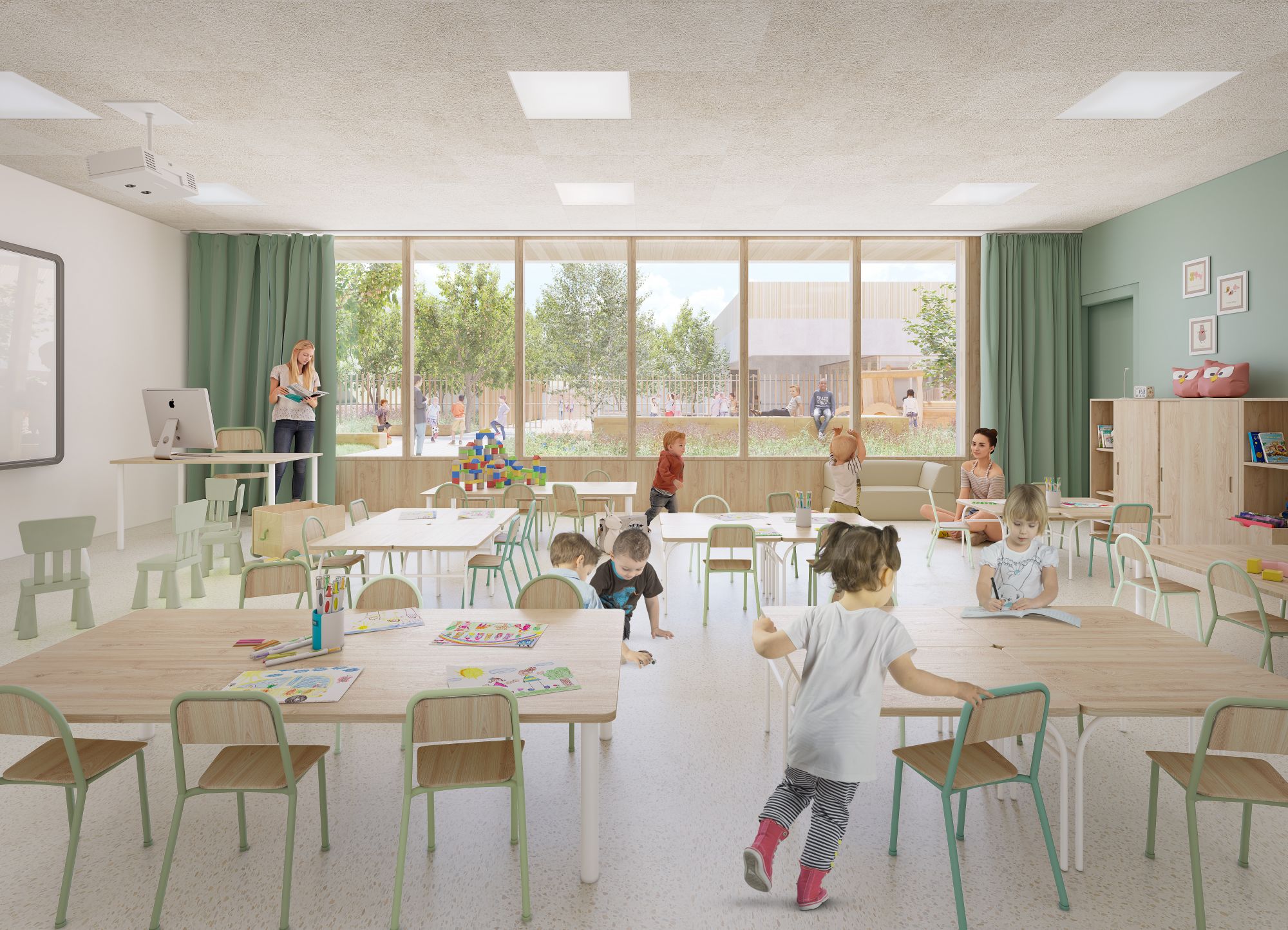 À l’arrière de la parcelle, les espaces en rez-de-chaussée, dédiés aux jeunes élèves et aux réfectoires, s’étendent harmonieusement dans la topographie du terrain, avec des cours de récréation agencées autour de ces espaces. Enfin, la toiture, pensée comme une cinquième façade, alterne verrières et panneaux photovoltaïques pour une optimisation énergétique, tout en limitant la visibilité des réseaux pour préserver l'esthétique.