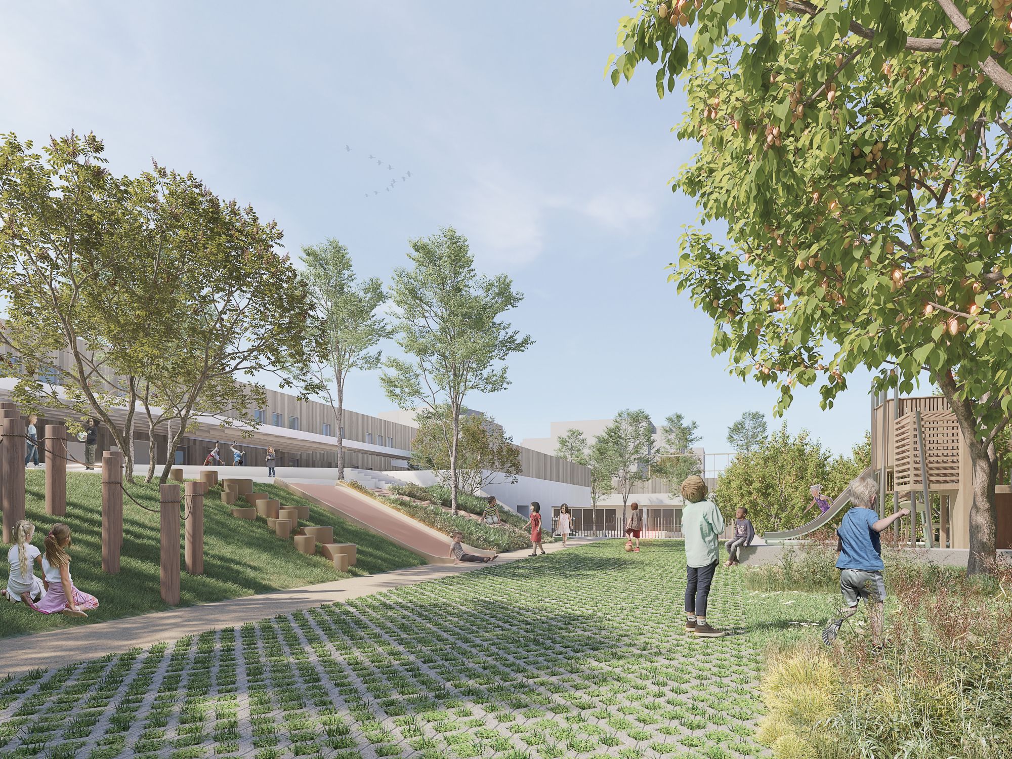 L’architecture scolaire est un outil pédagogique qui doit favoriser l’épanouissement de l’enfant, sa culture, et sa socialisation. Le modèle traditionnel d’école « caserne » laisse aujourd’hui place à celui d’école « village », intégrée dans son paysage et respectueuse de l’environnement. Cette vision poétique d’une école village nous a particulièrement séduits pour un quartier situé sur une ancienne plaine maraîchère.