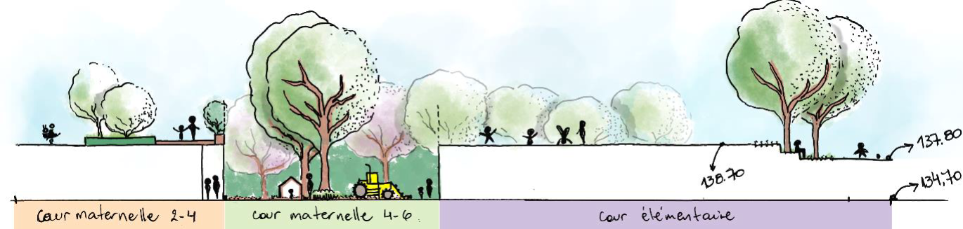 L’organisation des cours du projet s'adapte à la topographie du terrain, avec différents niveaux pour compenser les trois mètres de dénivelé. Les cours maternelles et élémentaires se répartissent en espaces minéraux pour les jeux actifs proches du bâtiment, puis en espaces ludiques plus végétalisés avec des zones de jeux en bois et un thème de jardin. La cour calme, située au nord, est dédiée aux activités pédagogiques comme les potagers. Les préaux, en bois et dotés de panneaux translucides, offrent des zones paisibles. Les clôtures intérieures, modulables, permettent la mutualisation des cours, et un portail ouvre le terrain aux habitants les week-ends.