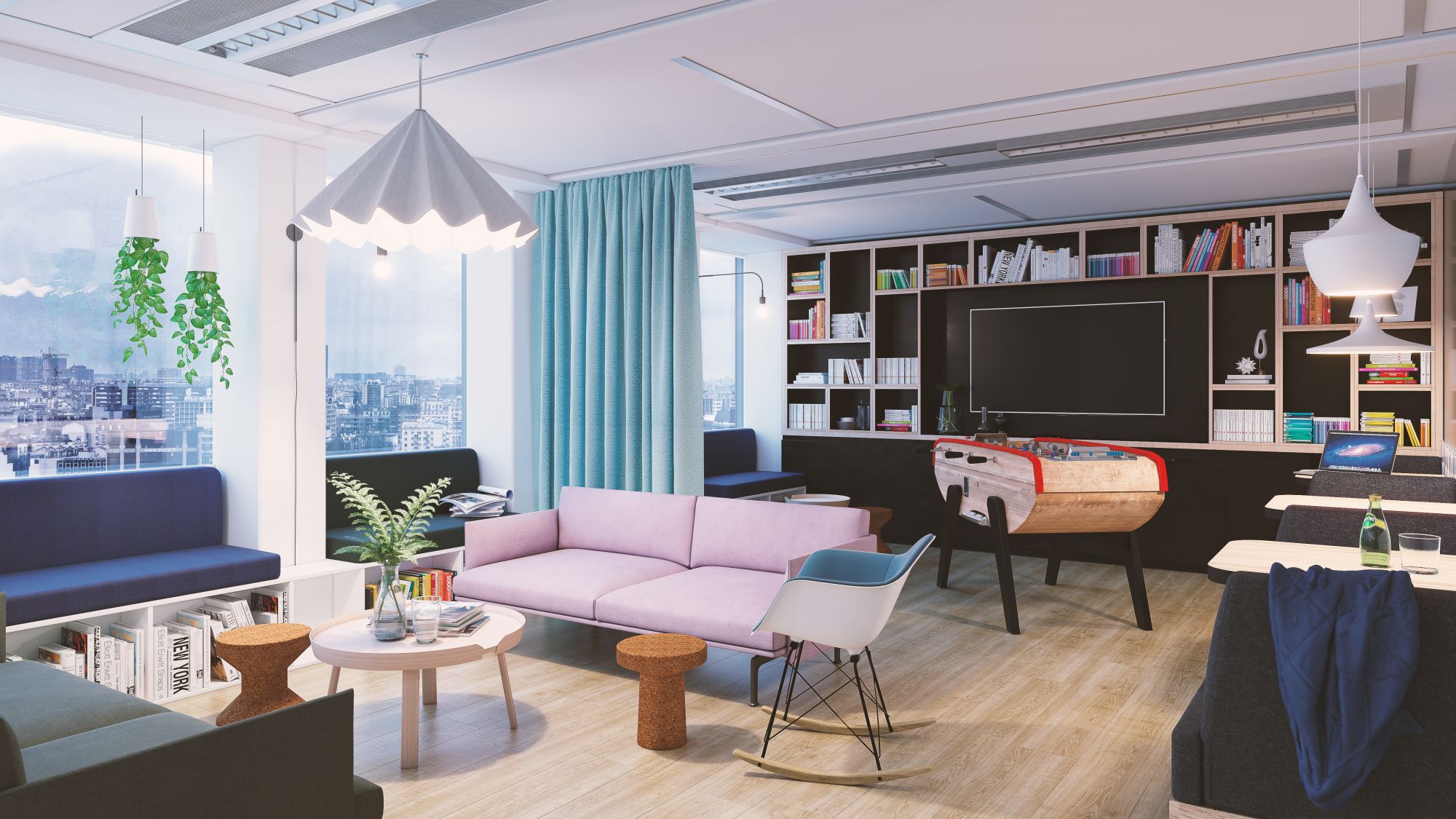 Petites tables avec fauteuils face à face façon Diner américain, table haute commune ou alcôves agencées devant les grandes fenêtres permettent de varier les positions selon les usages